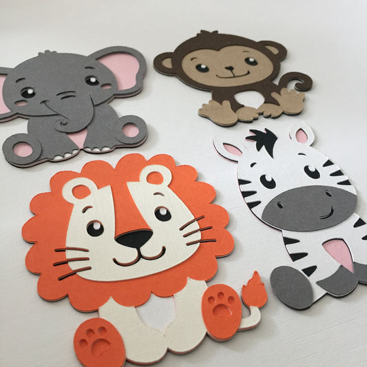 4 ZOO ANIMAL Die Cut Card Making Toppers - LION, MONKEY, ELEPHANT, ZEBRA